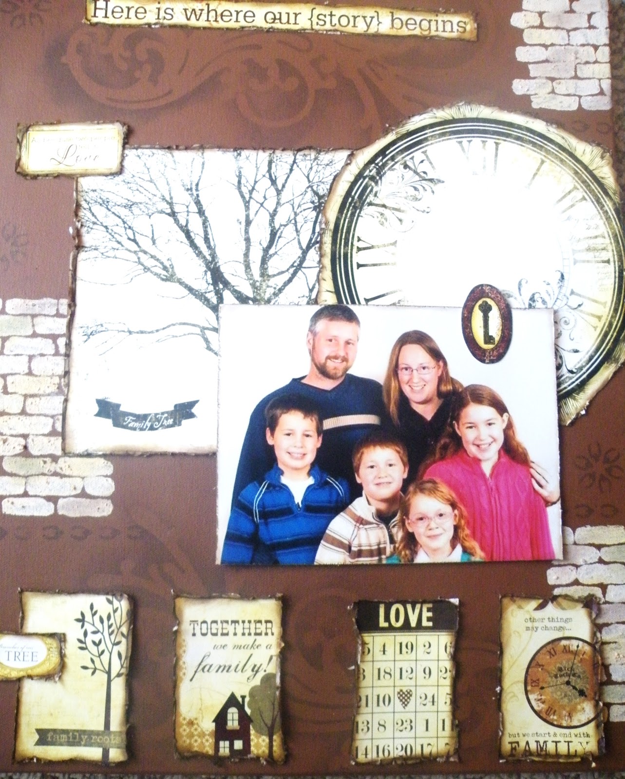 This is one of two 16 x 20 canvases I made for the family who has our first born puppy, Willow. This photo was taken in December of their children and I found the idea on Erin Blegin's blog and just loved the wording so I've changed the design to suit a single photo and used Bo Bunny paper, distressing with Tim Holtz Walnut Ink, the windows and shutters are popped up with a second layer, the clock is popped up, the hinges are Tim Holtz grundge board, misc brads, and 3 little metal embellies from Tim Holtz. The canvas was painted with Delta Spice Brown. I used Glossy Accents by Ranger to attach the letters and most of the other items to the canvas but used Mod Podge on the back of the paper.
